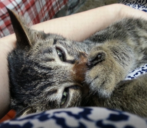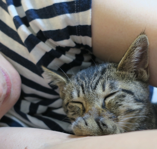 キジトラとサビで毛色や模様はまったく違うものの、目元のアイラインがくっきりしているところがそっくり、かわいい!。背中をなでてみると、はっぴーよりすこし小ぶりだ。