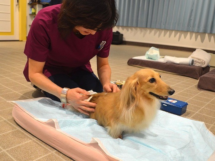 24時間体制のシフト勤務で、それぞれのワンちゃんの体調や特徴に合わせたケアを行っています。いつ何があるかわからないこともあり、24時間スタッフ常駐の形を取っています。ワンちゃんの状態によって、夜中でも飲水・食事の介助や体位変換が必要だったり、排泄の介助が必要だったり、必要とするケアは様々です。寝たきりにならないように、筋力を維持するトレーニングをすることもあります。