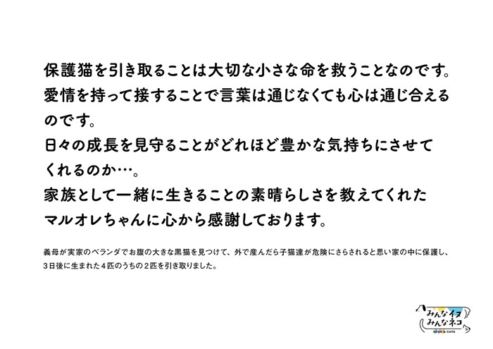 保護猫を引き取ることは大切な小さな命を救うことなのです。愛情を持って接することで言葉は通じなくても心は通じ合えるのです。日々の成長を見守ることがどれほど豊かな気持ちにさせてくれるのか…。家族として一緒に生きることの素晴らしさを教えてくれた マルオレちゃんに心から感謝しております。
