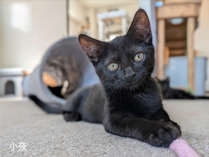 紹介文:大雨が続く中、車通りの多い住宅街で一生懸命過ごしていました。無事に3匹の黒猫姉弟を保護、姉弟仲良くいつも保護部屋の中を走り回って遊んでいます! 小夜ちゃんは3匹の中で1番体が小さいですが元気は負けていません!おもちゃなど大好きで遊ぶのが得意です!ちょっぴりまだビビりですが穏やかで可愛い女の子です❤︎