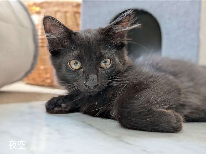 紹介文:大雨が続く中、車通りの多い住宅街で一生懸命過ごしていました。無事に3匹の黒猫姉妹を保護。毛が長いのが特徴的な黒猫の女の子です❤︎何にでも興味深々でいつも小夜ちゃんと追いかけっこしたり一緒にやんちゃしています。ご飯ももりもり食べていっぱいおもちゃでも遊びます。甘えん坊さんでとっても可愛い女の子です!