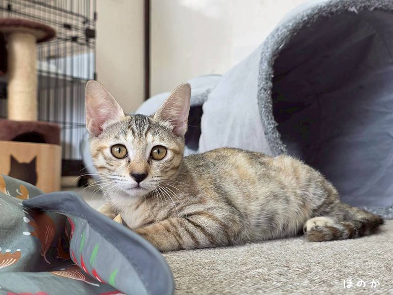 紹介文:真夏の暑い中、細い路地で、生後2カ月ほどの小さな体で一生懸命お外で過ごしていました! ほのか・福と一緒に保護しました。人慣れは順調に進んでおり、今では兄妹の中で1番甘えん坊で、抱っこされるのも大好きです! おもちゃで遊ぶのも大得意な女の子です! ご飯が欲しい時や甘えたい時はよく鳴いてアピールも上手です!