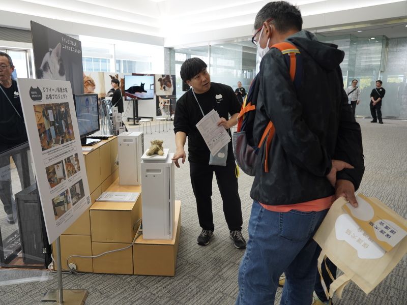 会場内には、犬や猫との幸せで快適な暮らしに役立つパナソニックの家電の体験コーナーも設けられました。犬や猫をお迎えした際は、ニオイや抜け毛が気になることもあります。来場者は、実際にジアイーノの脱臭力を確認したり、掃除機で床を掃除してみたりし、パナソニック社員の説明に耳を傾けていました。