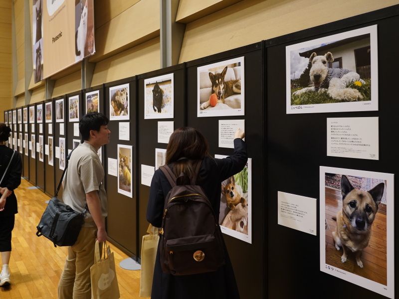 会場では、sippo主催の写真展「みんなイヌみんなネコ」も同時開催されました。元保護犬や元保護猫たちが新しい家族とくつろぐ姿や、家族と出かけた旅行先の楽しそうな笑顔など70枚の写真をパネルで展示。来場者は目を細めていました。