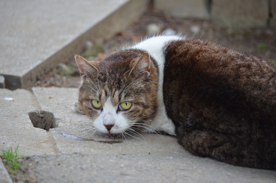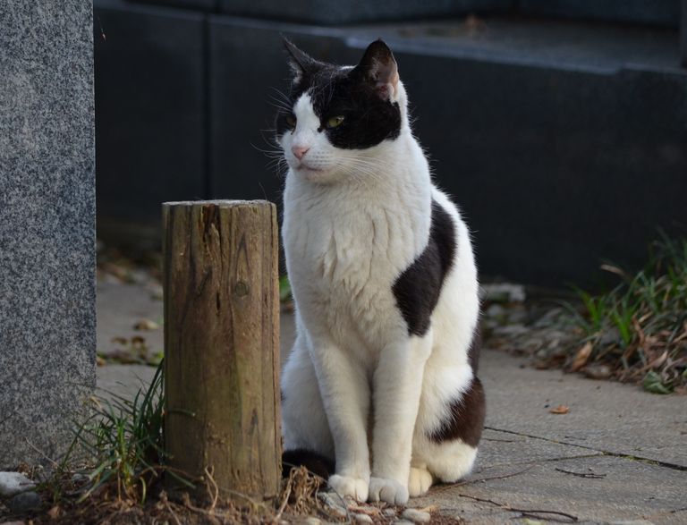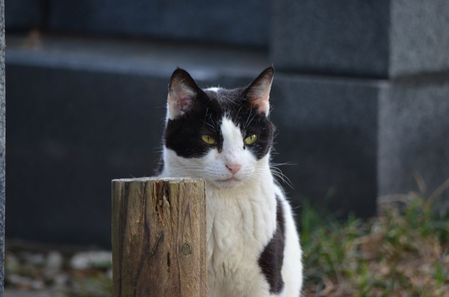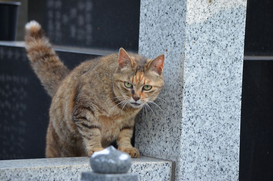 ネコたちはお墓の間や参道脇から現れて、のんびり水を飲んだり、毛繕いをしたり……。人に見られることに慣れていて、逃げることはない。それでも外で暮らしているだけあって、時折ちょっと野生味ある表情をみせる。
